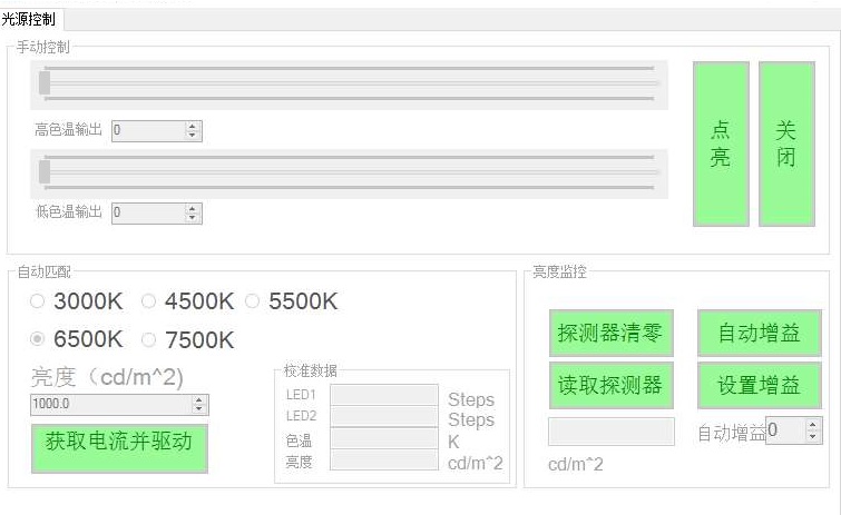 系統(tǒng)軟件界面如下圖。軟件界面清晰直觀,可手動(dòng)調(diào)節(jié)LED的電流大小,也可按照步數(shù)輸入期望的數(shù)值,實(shí)現(xiàn)精細(xì)調(diào)節(jié),實(shí)際調(diào)節(jié)精度遠(yuǎn)大于2星等。