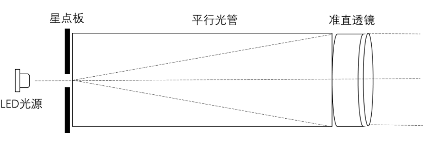 星光模擬器由LED光源,星點(diǎn)板,平行光管,準(zhǔn)直透鏡,驅(qū)動(dòng)電源,控制軟件等組成。通過調(diào)節(jié)LED的驅(qū)動(dòng)電流實(shí)現(xiàn)不同級(jí)別的亮度輸出,從而實(shí)現(xiàn)不同星等亮度要求。