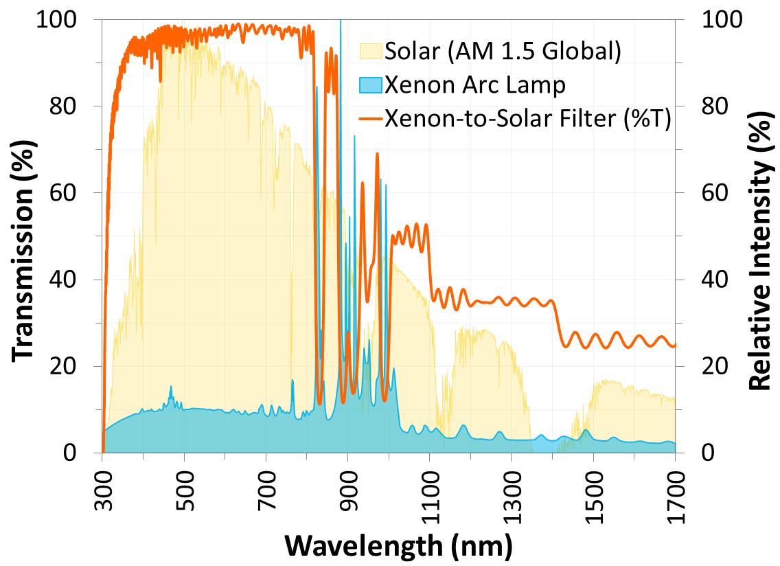 圖1.獨特的定制光學(xué)濾光片,旨在塑造氙弧燈的光譜,使其與太陽光相似。